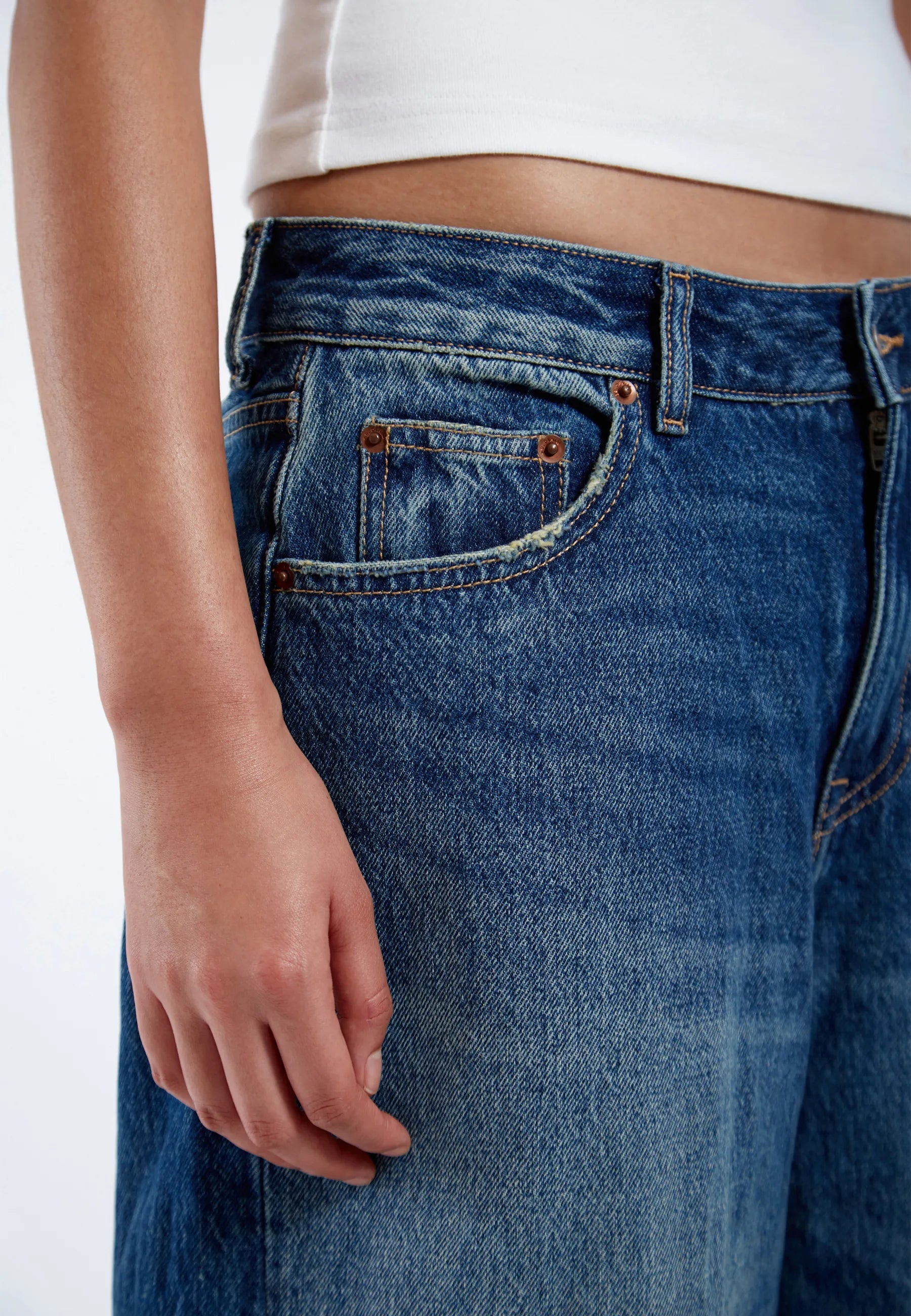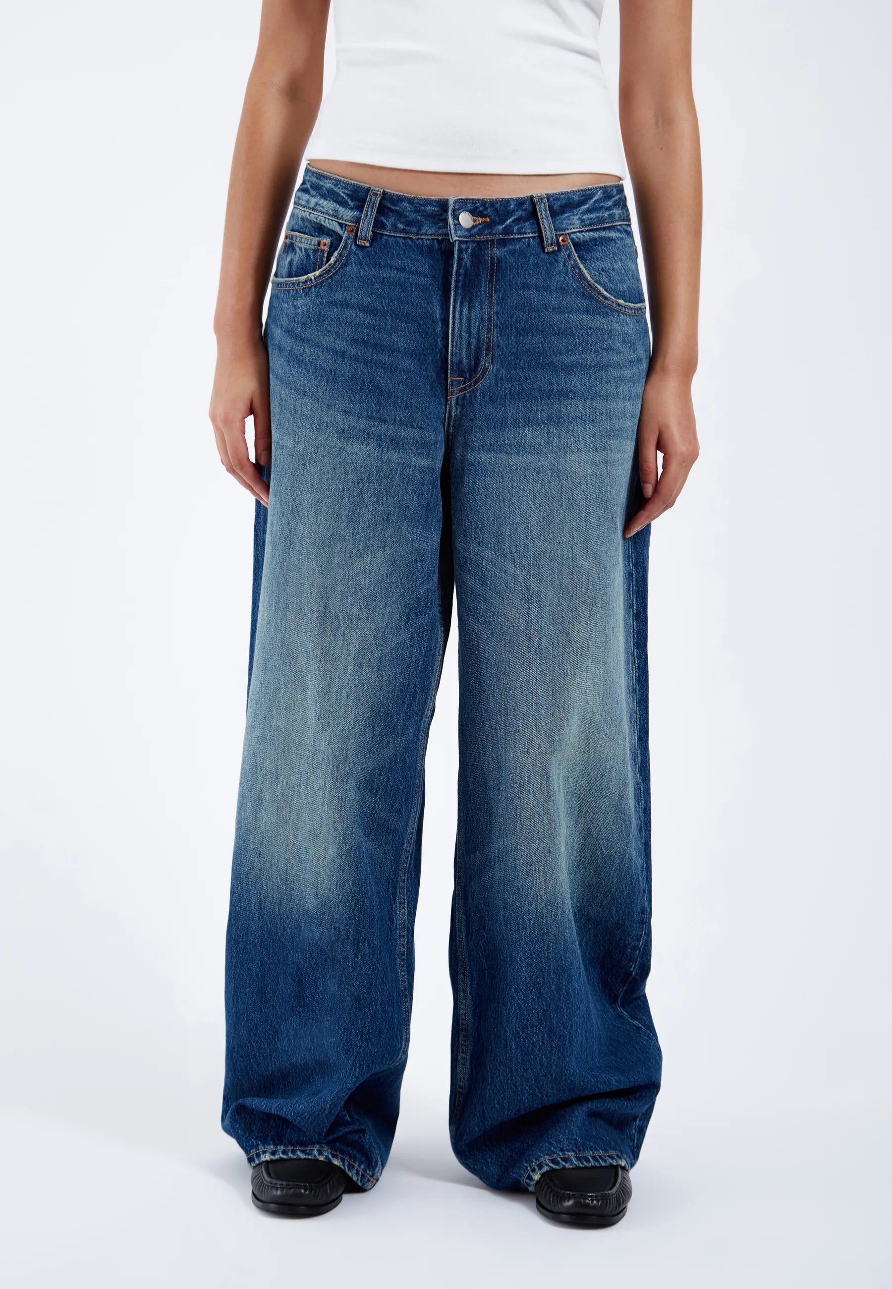 Baggy fit-jeans med låg midja, något droppad gren och vida raka ben. Klassisk 5-ficksdesign med dragkedja. Dessa jeans är tillverkade av ett styvt, icke-stretchigt denimtyg.