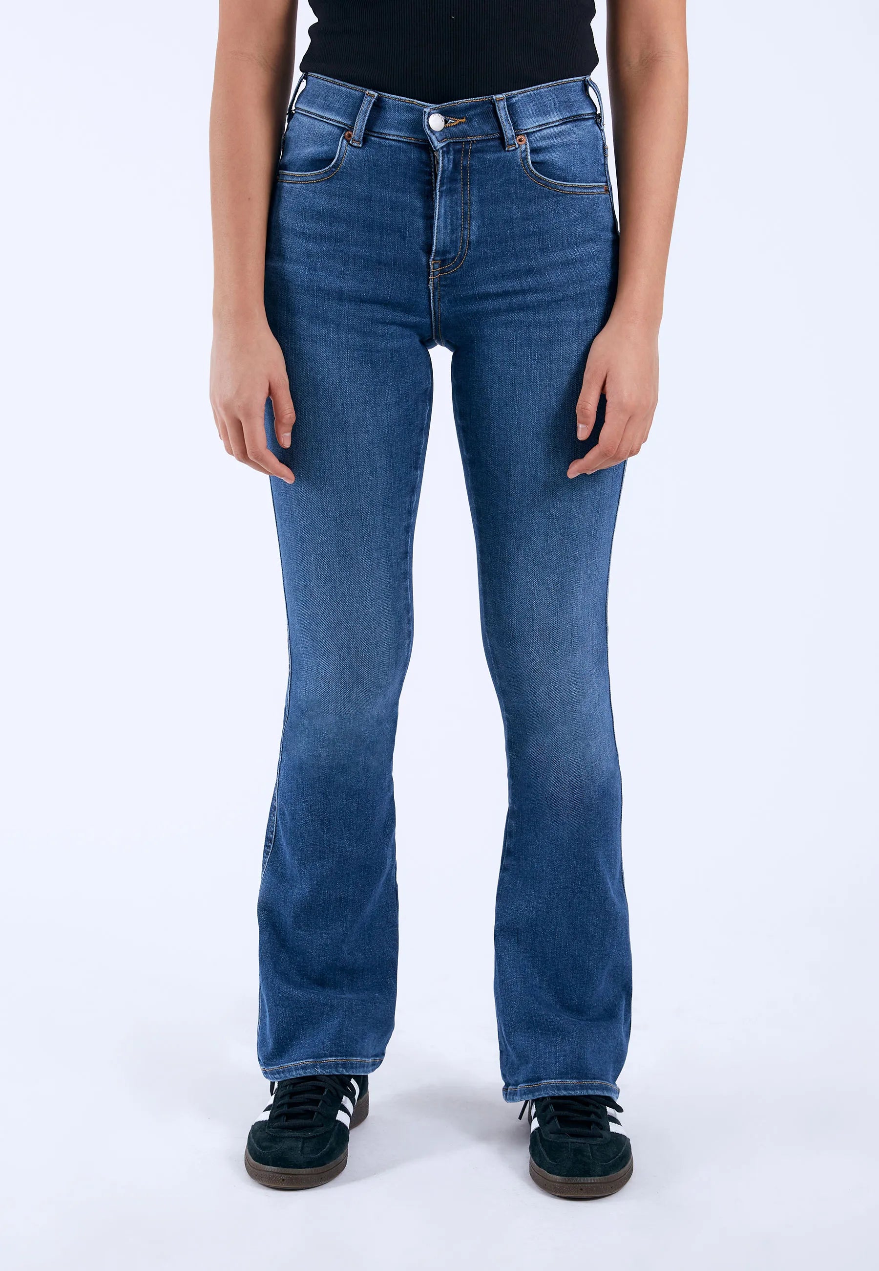 Slim fit-jeans med normal midja och bootcut-ben. Har fram- och bakfickor samt dragkedja. Dessa jeans är gjorda av ett denimtyg med hög stretch.