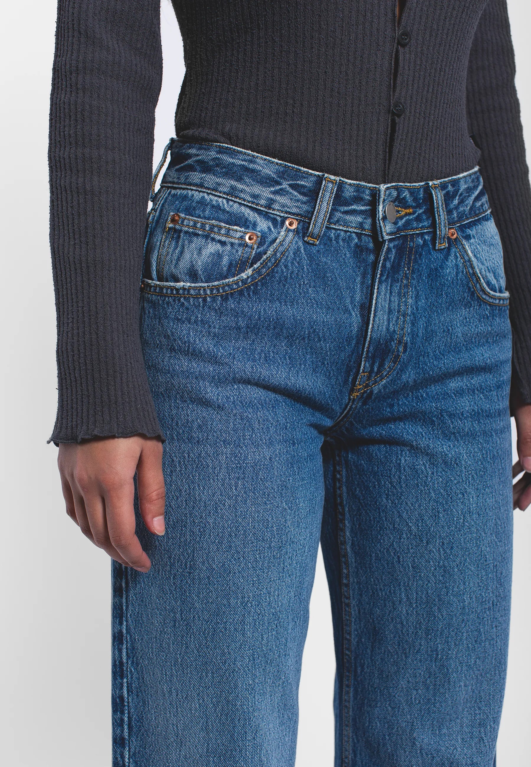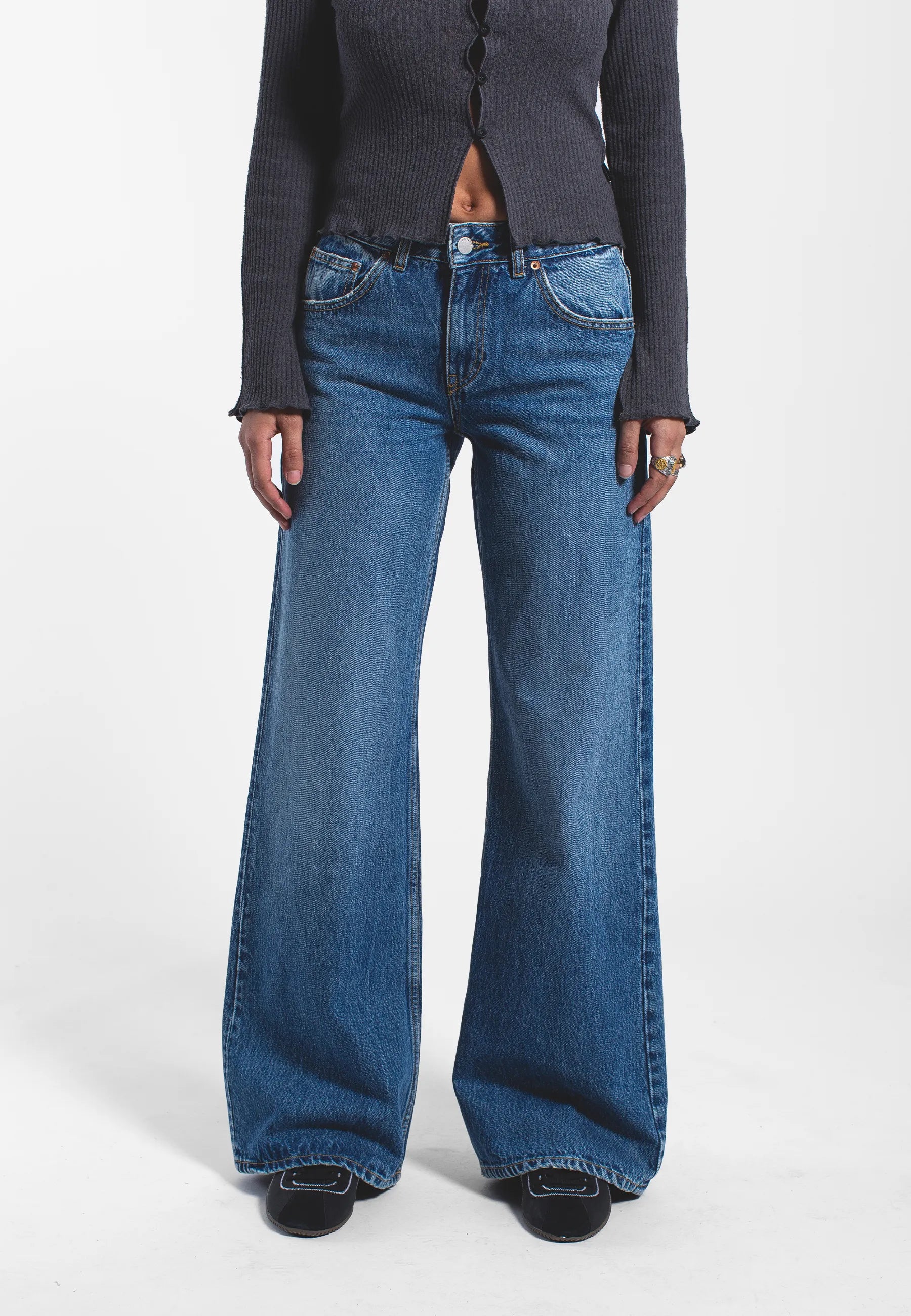 Regular fit jeans med låg midja och avslappnad utsvängd ben. Klassisk 5-ficksdesign med dragkedja. Dessa jeans är tillverkade av ett styvt, icke-stretchigt denimtyg.
