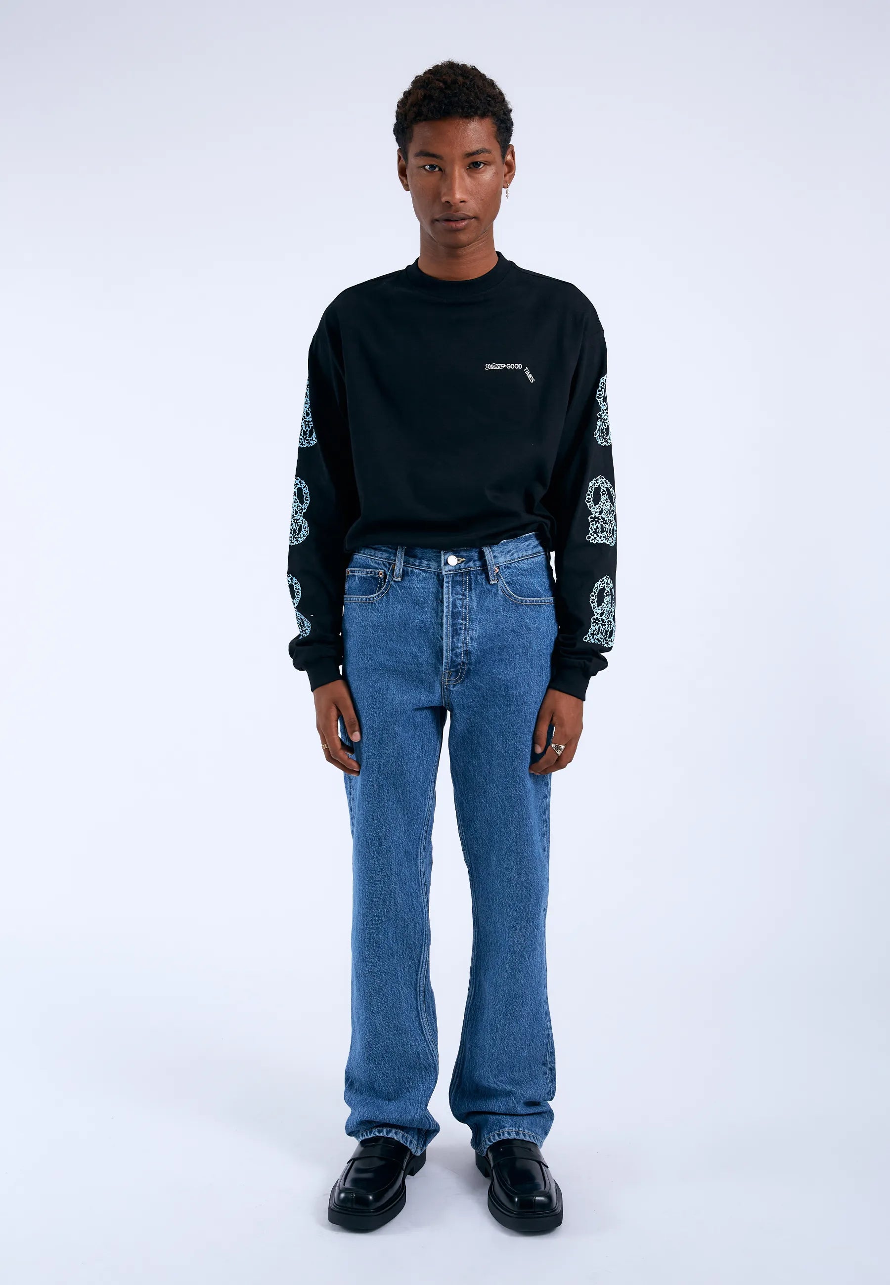 Regular fit jeans med normal midja och bootcut-ben. Klassisk 5-ficksdesign med knappgylf. Dessa jeans är tillverkade av ett stelt, icke-stretchigt denimtyg.