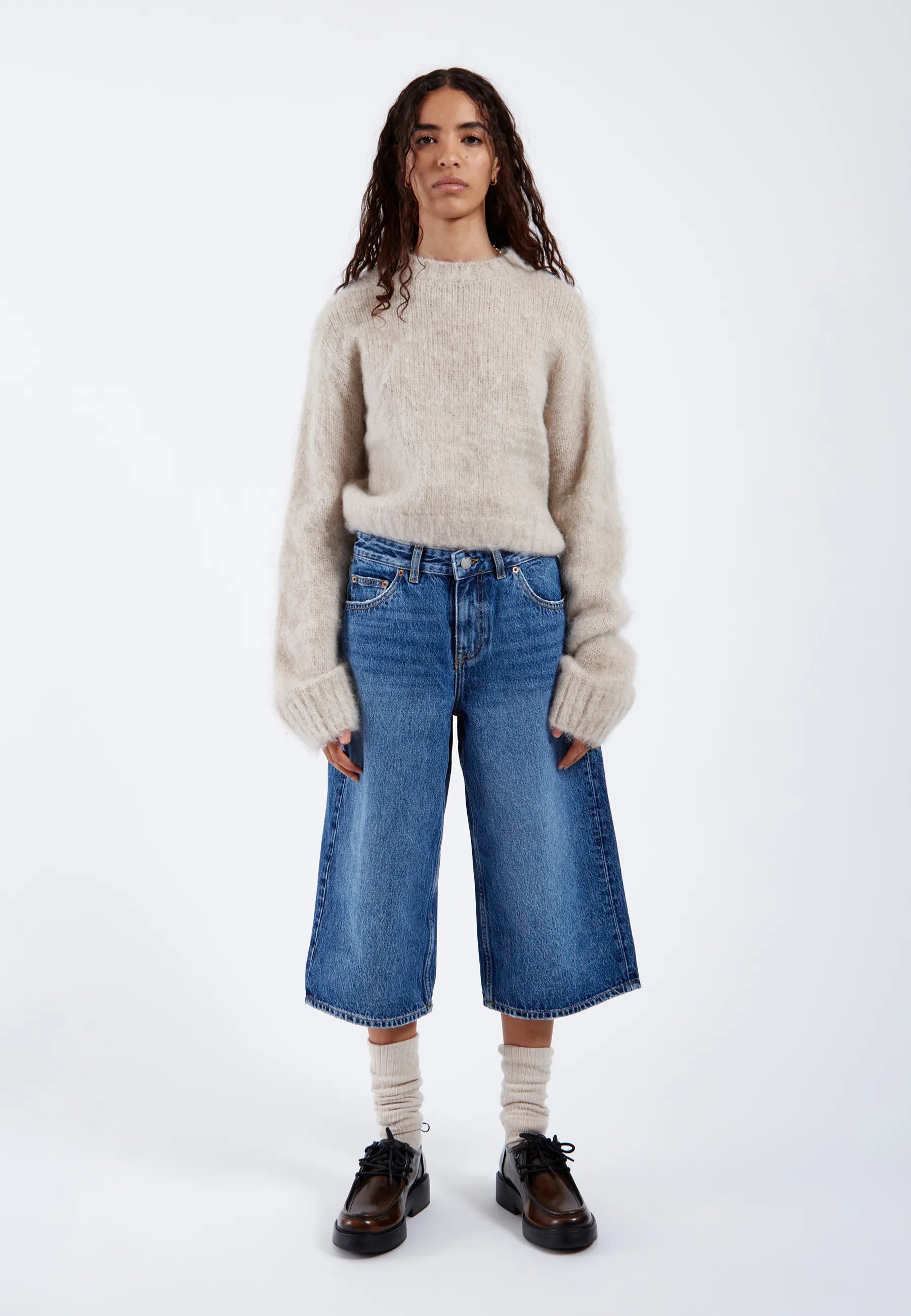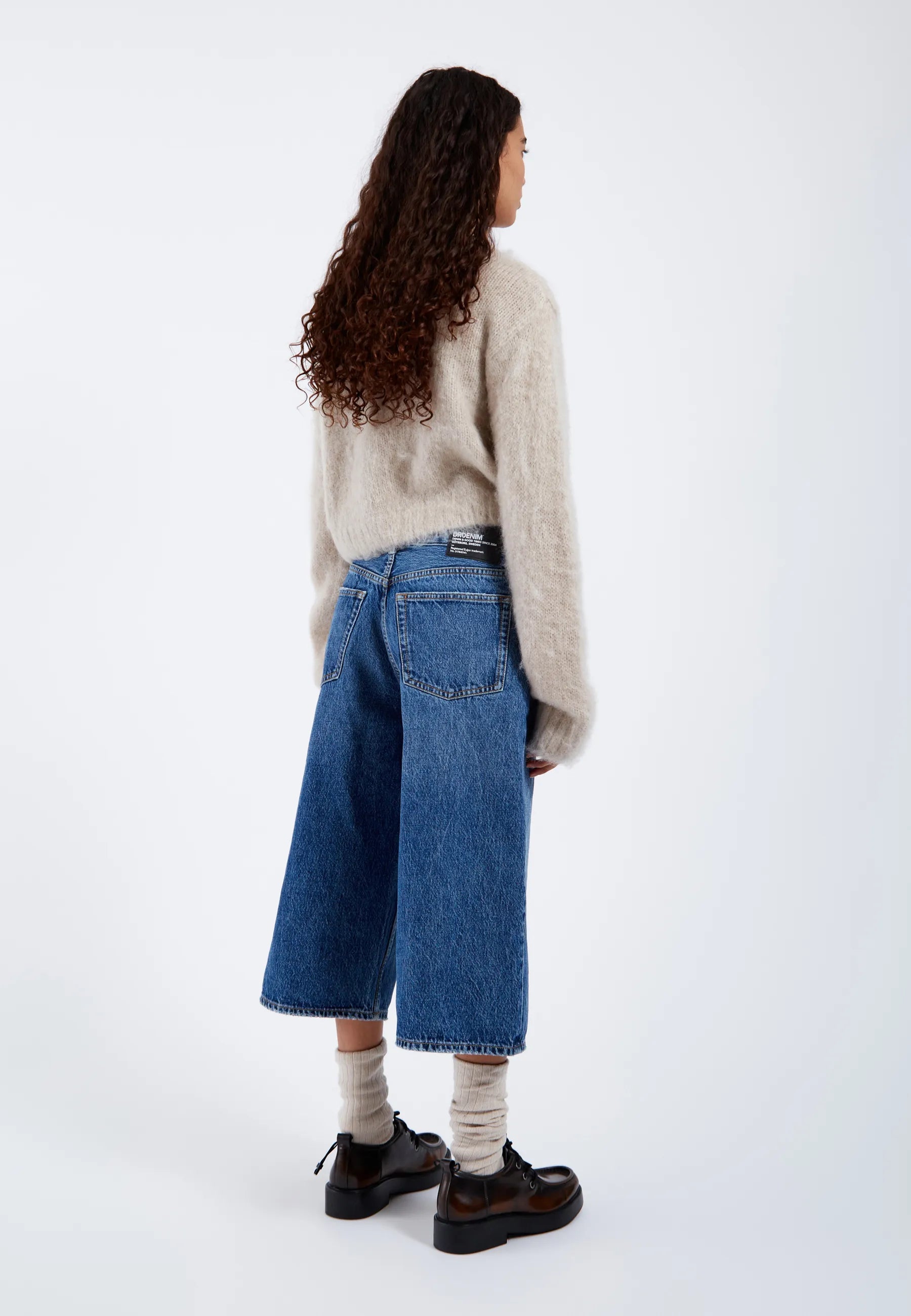 Relaxed fit jeans med normal midja och vida raka capriben. Klassisk design med fem fickor och dragkedja. Dessa jeans är tillverkade i ett styvt, icke-stretchigt denimtyg.